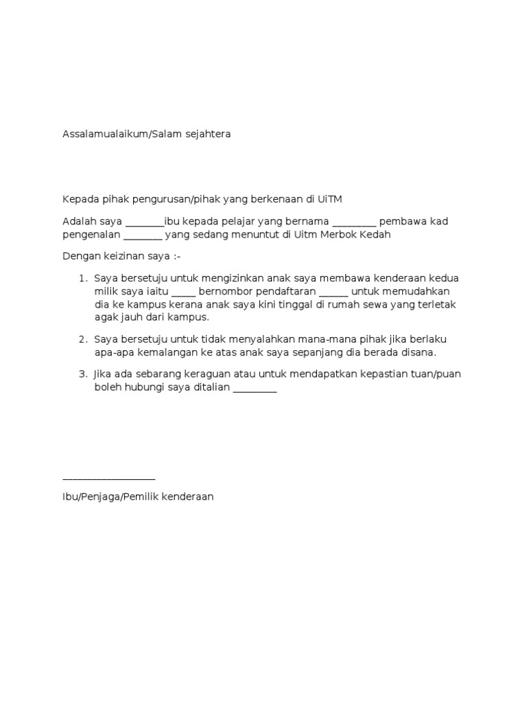 Contoh Surat Kebenaran Ibu Bapa Membawa Kenderaan Contoh Surat
